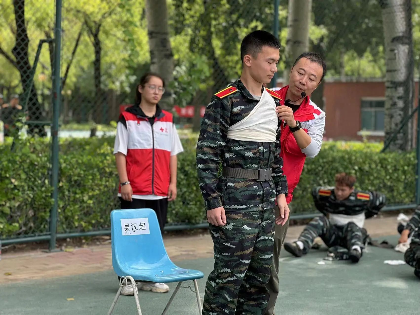 急救包扎训练是军训中一项至关重要的实践课程。北京红十字会的工作人员到校为新生们开展急救包扎教学训练。