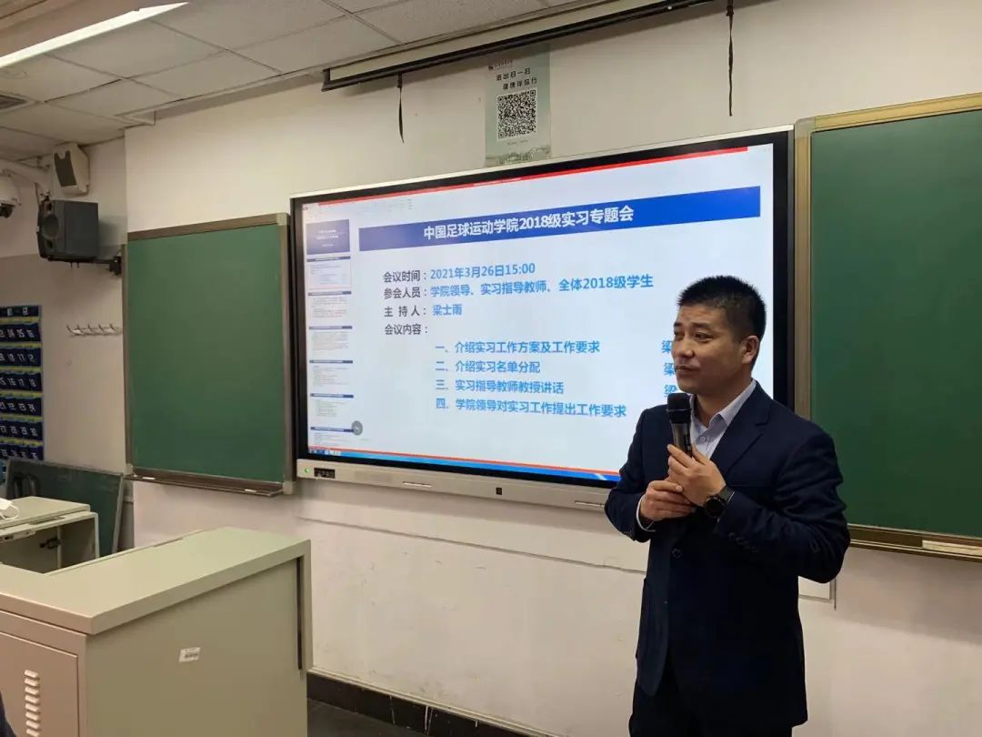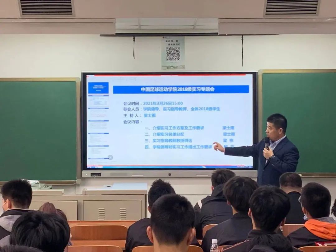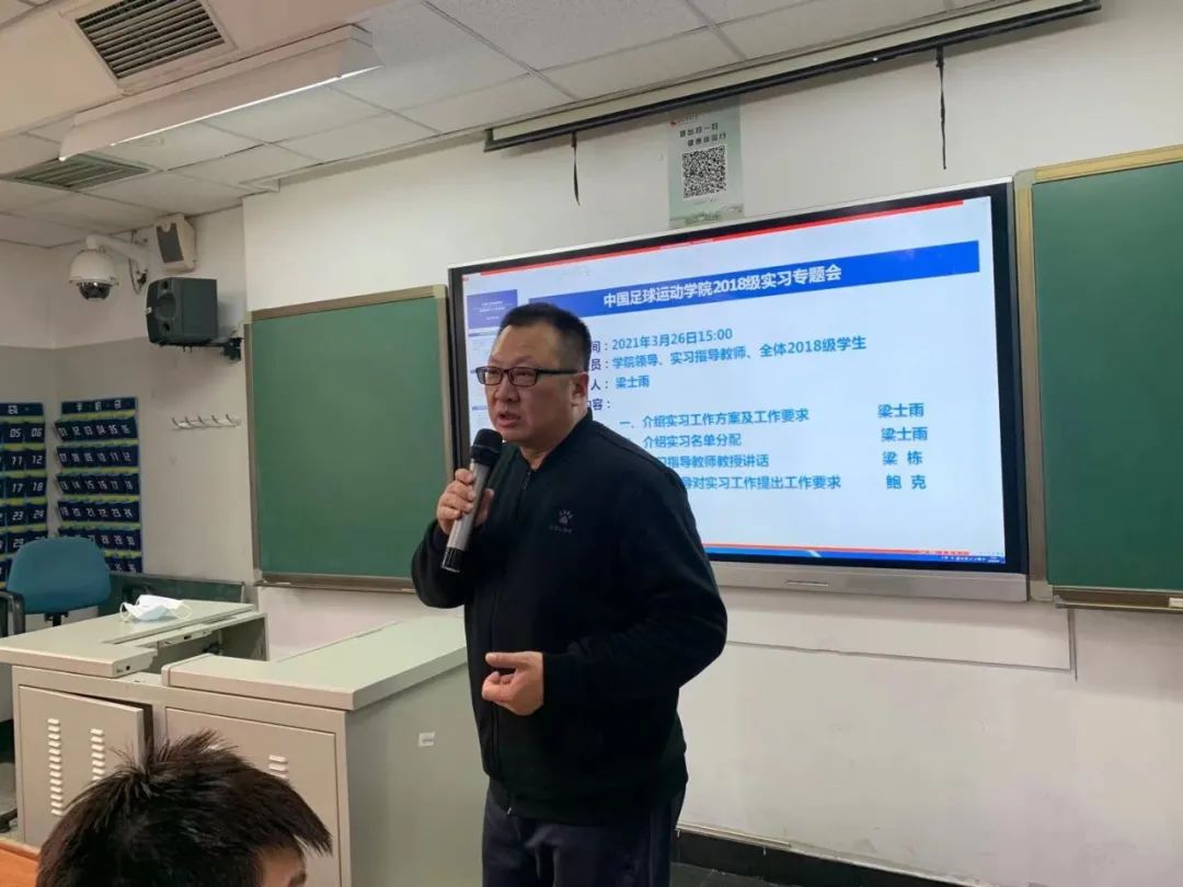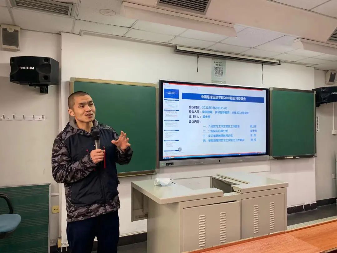 3月26日下午三点,中国足球运动学院2018级实习部署动员大会于在教室召开,到场的有中国足球运动学院党总支副书记鲍克老师、梁栋教授、研究生辅导员张博老师、18级辅导员梁士雨老师。